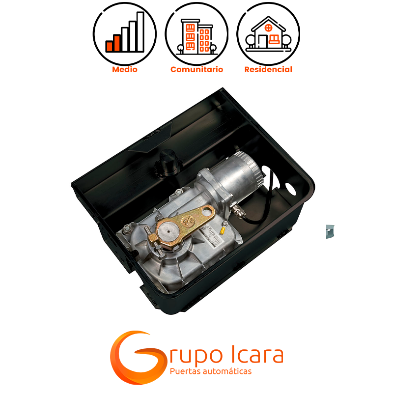 Este motorreductor ofrece un horario de apertura de 90° en aproximadamente 17 segundos, proporcionando un movimiento rápido y eficiente de las puertas. El par máximo es de 320 Nm, lo que asegura un movimiento fluido y seguro incluso en condiciones de carga elevada.